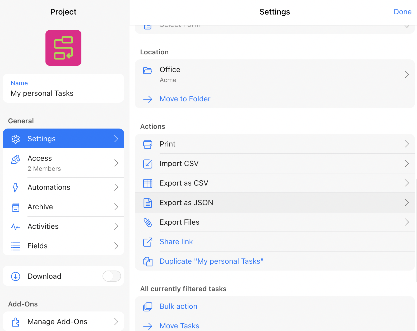 Wählen Sie zum Export als JSON-Datei das entsprechende Feld im Abschnitt "Aktionen" aus.