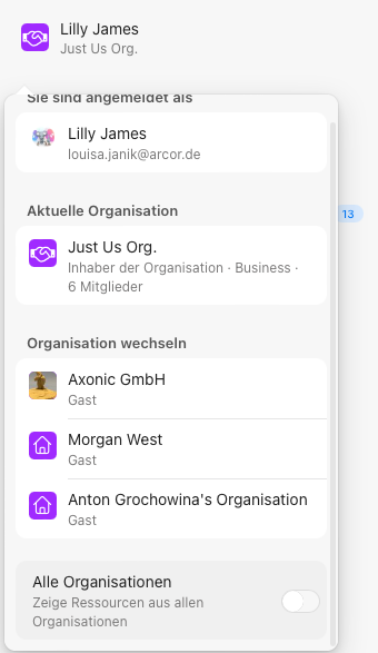 Es gibt verschiedene Möglichkeiten, um zu sehen, zu welcher Organisation die Listen gehören. Eine Möglichkeit wäre, das Navigationspanel auf der linken Seite des Bildschirms auszuklappen und im oberen Bereich auf die aktuelle Organisation. Scrollen Sie nach ganz unten und aktivieren Sie "Alle Organisationen".