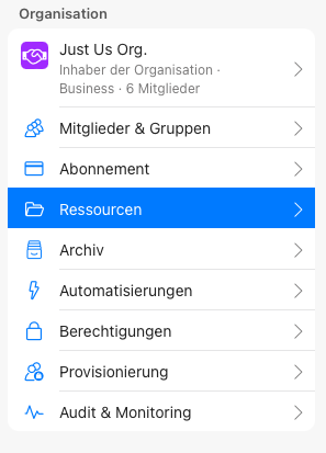 Auf der linken Seite des Menus finden Sie einen gesamten Abschnitt vor, der allein Ihrer eigenen Organisation gewidmet ist.