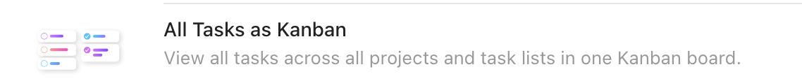 Mit dem globalen Kanban-Board haben Sie all Ihre Aufgaben und Fortschritte auf einen Blick und können sich so schnell einen Überblick über das Voranschreiten all Ihrer Projekte verschaffen. Um ein globales Kanban zu erstellen, klicken Sie auf das "+"-Symbol im Navigations-Panel und wählen Sie "Alle Aufgaben als Kanban".
