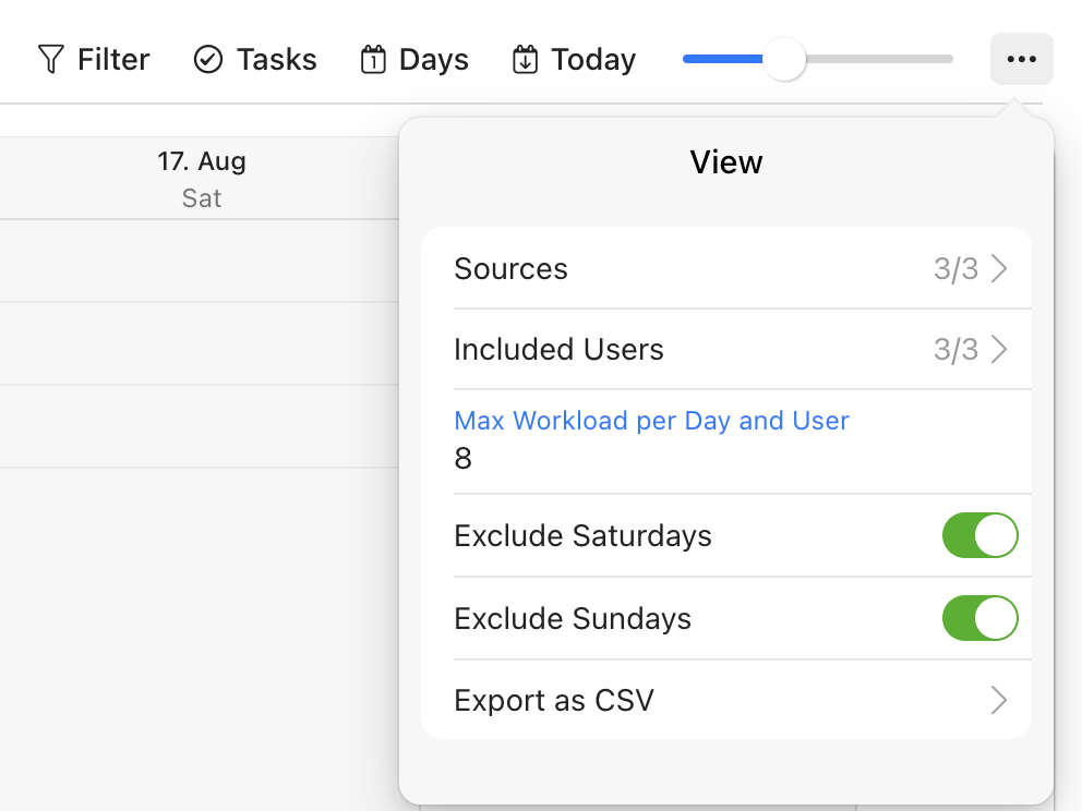 Wählen Sie "Included Lists" um anzupassen, welche Listen in der Übersicht zu sehen sollten sein. Bei "Maximaler Workload pro Tag und Nutzer" können Sie beliebig anpassen, wie hoch der Workload täglich für Ihre Mitarbeiter sein sollte. Der Wert ist essentiell für die Ressourcenplanung. Zudem können Sie mit einem Klick auf die Schalter Samstage und Sonntage ausschließen. (grün bedeutet ausgeschlossen).